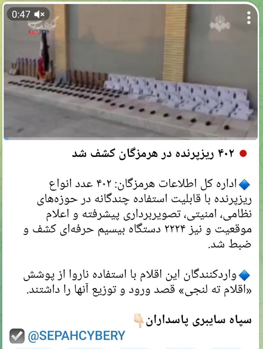 وزارت اطلاعات جمهوری اسلامی سوم تیر از توقیف ۴۰۲ پهپاد در دو شهر استان هرمزگان خبر داد. رسانههای حکومتی نیز در گزارش خود، تصویری از پنج پهپاد تهاجمی با باتریهای آبیرنگ منتشر کردند.
