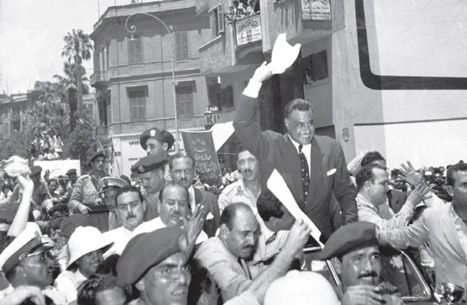جمال عبدالناصر، رییس‌جمهوری مصر روی دوش مردم پس از اعلام ملی‌شدن کانال سوئز، سال ۱۹۵۶