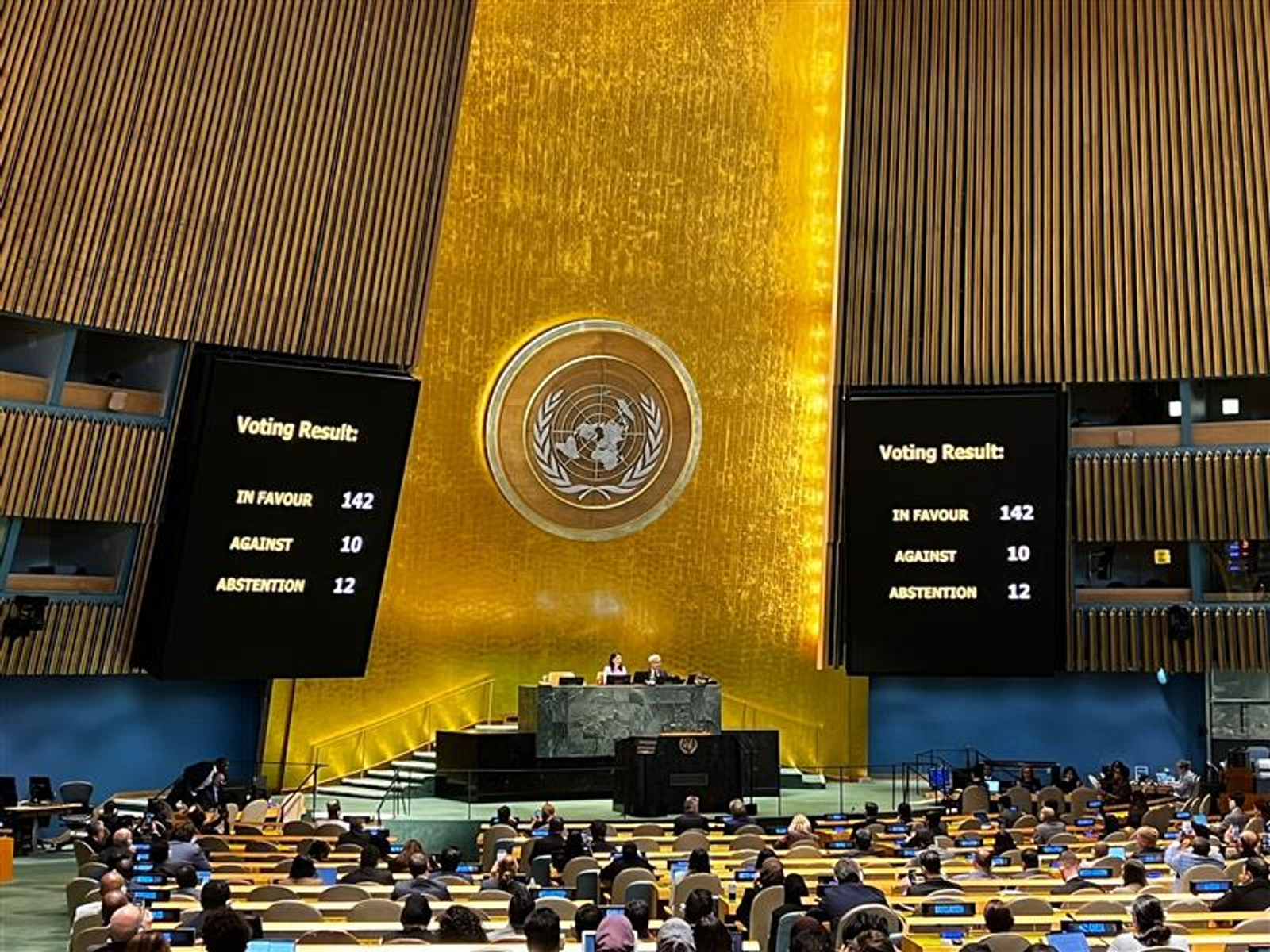 مجمع عمومی سازمان ملل متحد روز جمعه با ۱۴۲ رای موافق، ۱۰ رای مخالف و ۱۲ رای ممتنع قطعنامه‌ای را تصویب کرد که بر حمایت از راه‌حل دو‌کشوری تاکید دارد. این قطعنامه به ابتکار فرانسه و عربستان سعودی ارائه شده بود.