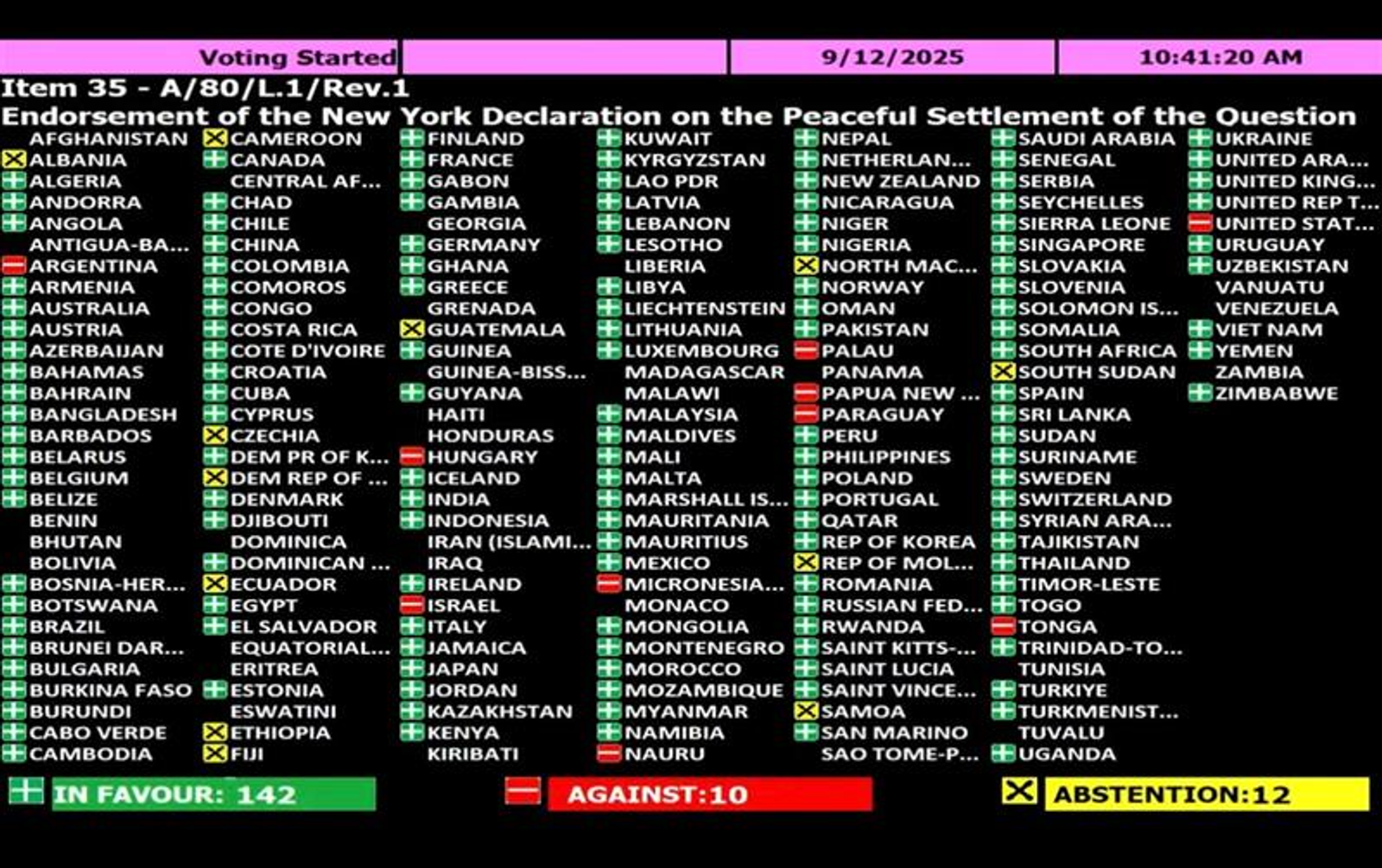 مجمع عمومی سازمان ملل با ۱۴۲ رای موافق، ۱۰ رای مخالف و ۱۲ رای ممتنع قطعنامه‌ای را تصویب کرد که گام‌های مشخص، زمان‌بندی شده و برگشت‌ناپذیر برای رسیدن به راه‌حل دو کشوری میان اسرائیل و فلسطینیان را ترسیم می‌کند. این اقدام پیش از نشست رهبران جهان در مجمع عمومی سازمان ملل صورت گرفت.