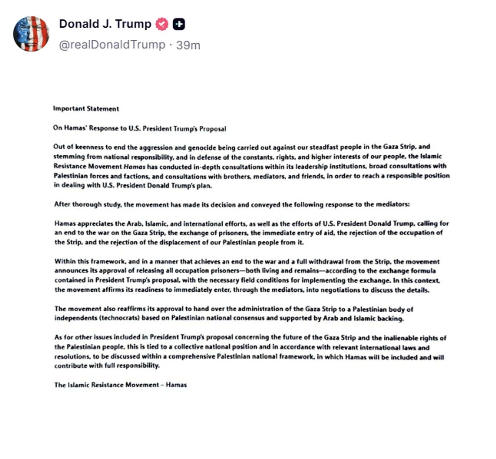 دونالد ترامپ، رییس‌جمهوری ایالات متحده، روز جمعه متن کامل بیانیه جنبش حماس را درباره پاسخ این گروه به پیشنهاد آمریکا برای پایان جنگ در غزه منتشر کرد.