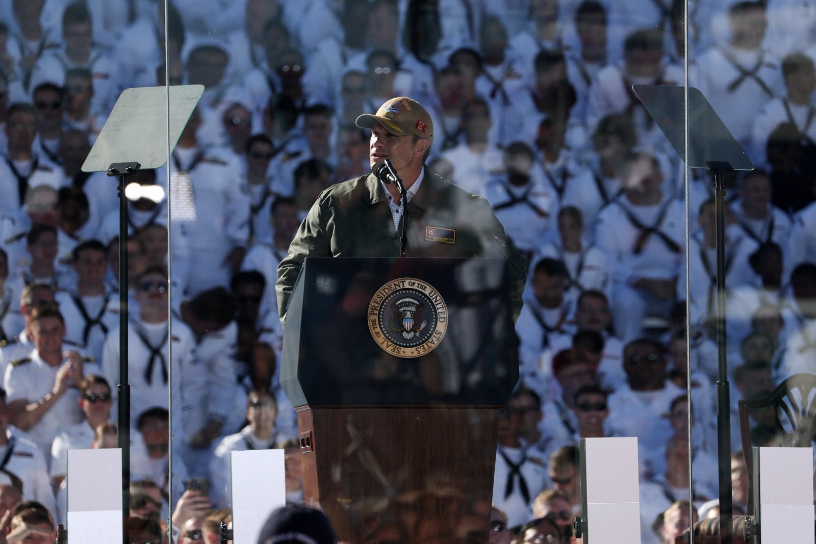 پیت هگست نیز در حضور هزاران ملوان و اعضای ارتش تاکید کرد که «برقراری صلح از طریق اقتدار» اولویت وزارت جنگ است و رییس‌جمهوری آمریکا به عنوان فرمانده کل قوا تضمین می‌کند که جنگاوران همه آنچه را برای بازدارندگی دشمنان نیاز دارند، در اختیار داشته باشند.