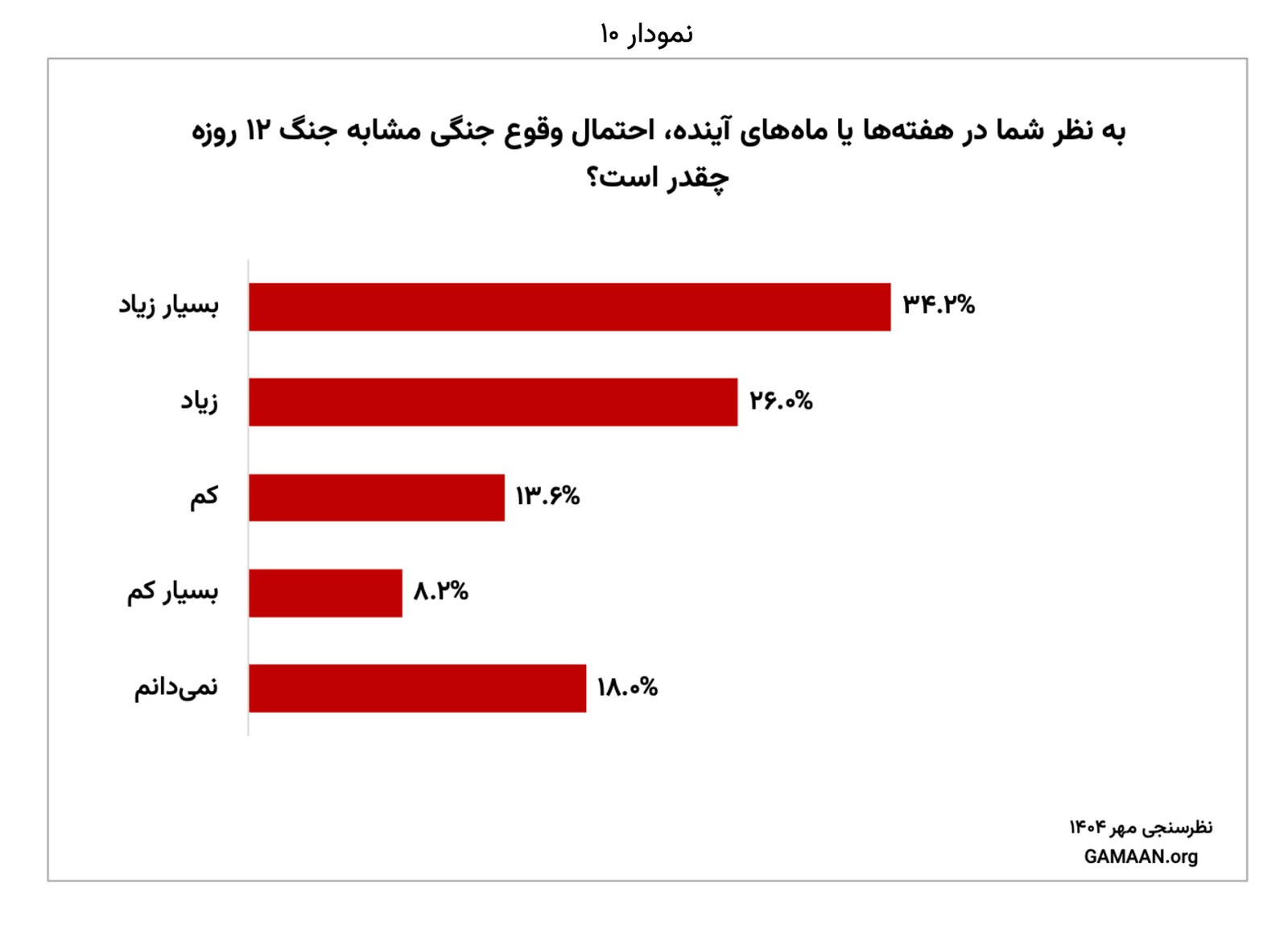 در پاسخ به پرسشی درباره احتمال وقوع رویارویی مشابه جنگ ۱۲ روزه، ۳۴ درصد از شرکتکنندگان احتمال آغاز چنین نبردی را «بسیار زیاد» و ۲۶ درصد آن را «تا حدی زیاد» ارزیابی کردند.