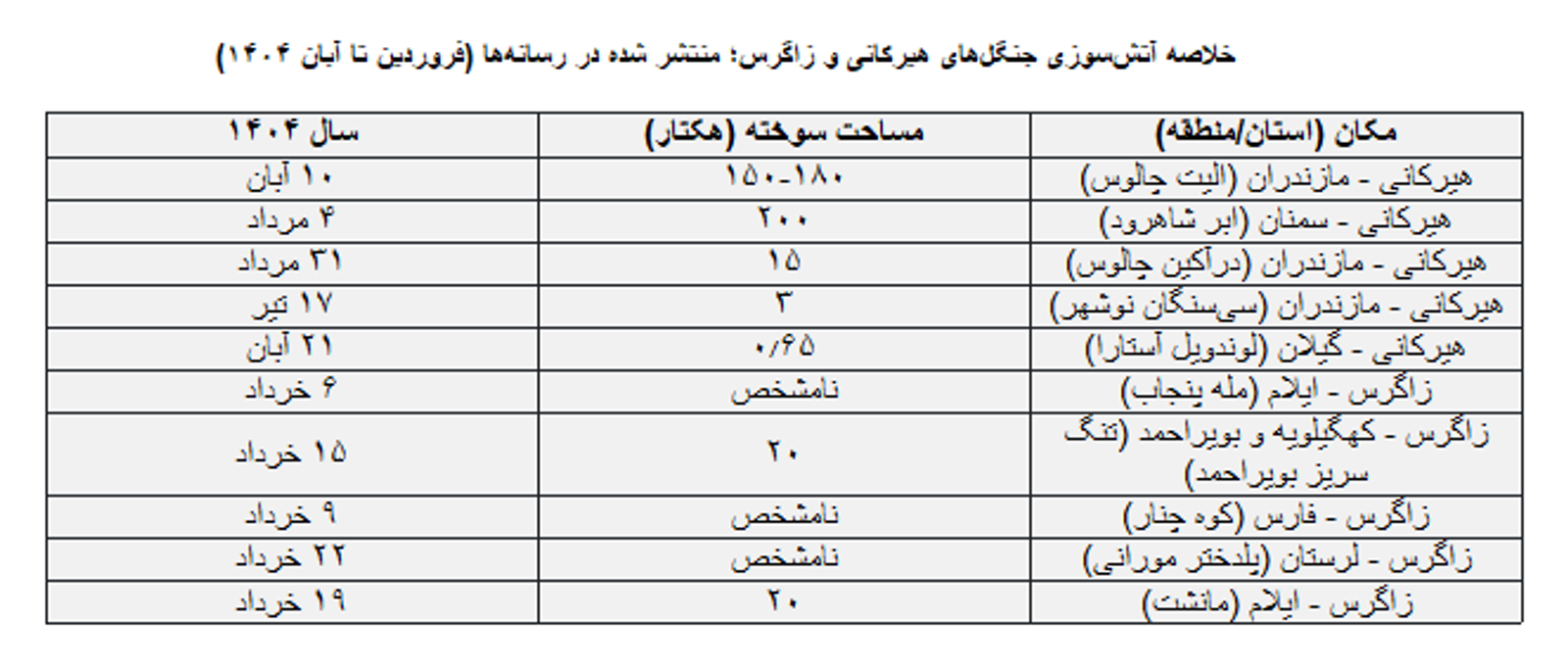 تا این لحظه نهتنها آمار دقیقی از میزان آتشسوزیهای اخیر منتشر نشده (تنها اطلاعات در دسترس در جدول زیر نمایش خلاصه شدهاند) که هیچ گزارش عمومی تجمیعشده و عدد دقیقی در دسترس نیست که نشان دهد «چند حریق» و «چند هکتار» از کل «جنگلهای هیرکانی و «جنگلهای زاگرس» در سال ۱۴۰۴ به خاکستر بدل شدند.