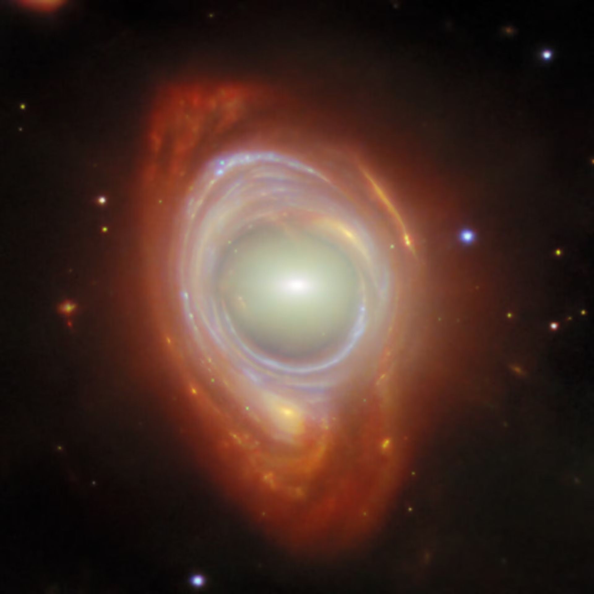 کهکشان نزدیکتر در مرکز تصویر قرار دارد و کهکشان دورتر به شکل یک حلقه نورانی اطراف آن دیده میشود؛ پدیدهای که به آن حلقه اینشتین میگویند.