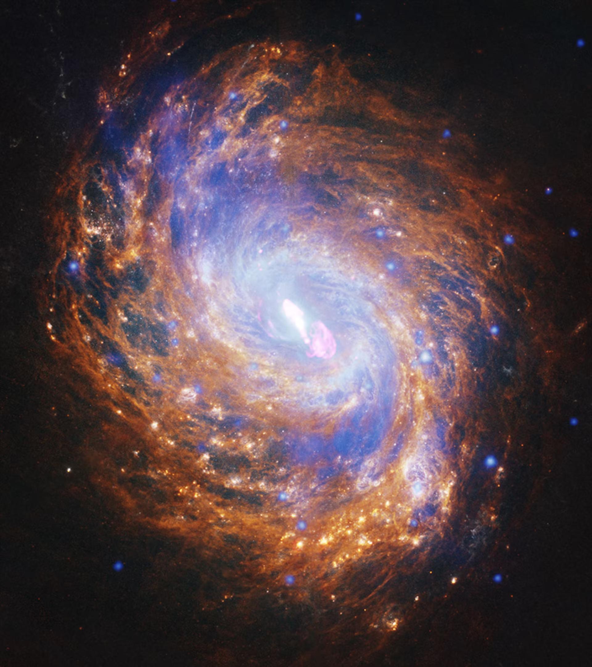این تصویر که در اصل با تلسکوپ فضایی هابل ثبت شده و بعدا با روشهای پردازش جدید بازسازی شده، کهکشان مارپیچی مسیه ۷۷ را نشان میدهد که با نام کهکشان ماهی مرکب هم شناخته میشود. این کهکشان در فاصله ۴۵ میلیون سال نوری و در صورت فلکی نهنگ قرار دارد.