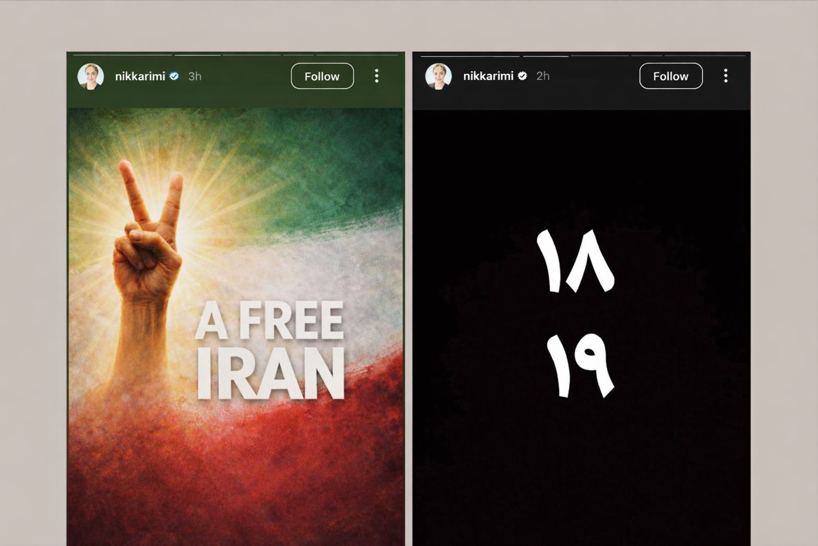 به عنوان نمونه، نیکی کریمی، بازیگر شناختهشده سینمای ایران، با انتشار دو استوری در صفحه شخصی خود در اینستاگرام، خواستار آزادی ایران شد و با نوشتن اعداد ۱۸ و ۱۹، بهصورت تلویحی از فراخوان برگزاری تجمعات اعتراضی علیه جمهوری اسلامی حمایت کرد.