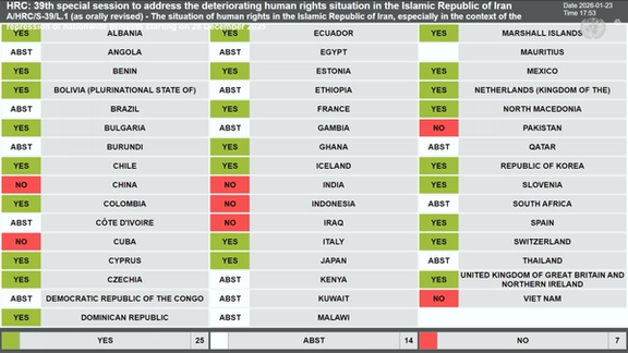 شورای حقوق بشر سازمان ملل متحد در جریان نشست ویژه خود، با تصویب قطعنامهای که از سوی بیش از ۲۰ کشور ارائه شده بود، وضعیت حقوق بشر در جمهوری اسلامی را «بهشدت نگرانکننده» خواند و سرکوب خشونتآمیز اعتراضات سراسری اخیر را قاطعانه محکوم کرد.