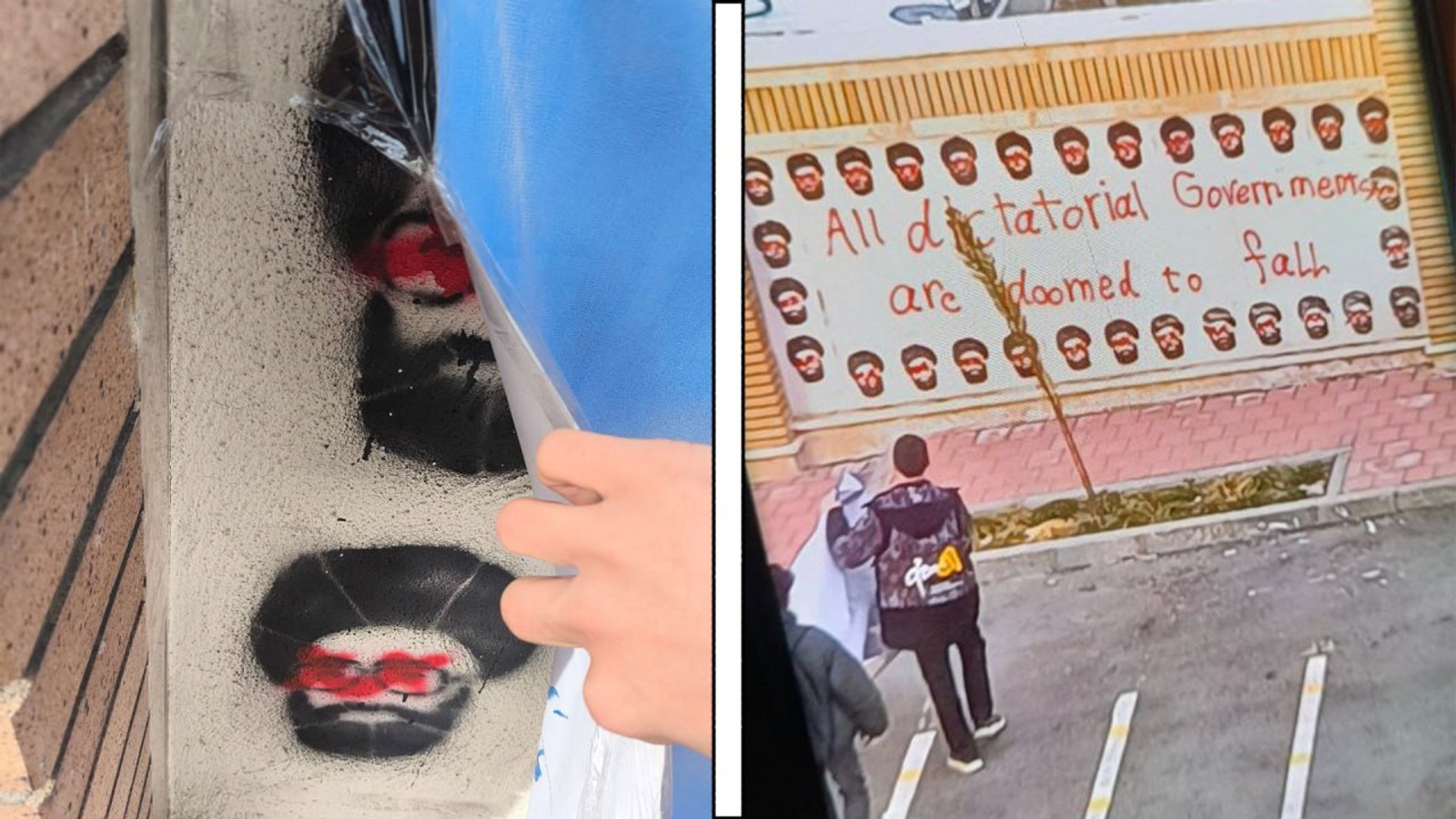 در یکی از این تصاویر، چهره علی خامنهای با خط قرمزی روی چشمانش دیده میشود.