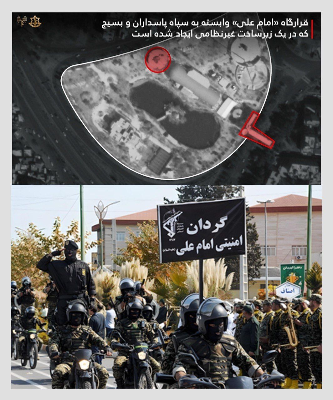 علاوه بر این، پایگاه‌های بسیج با گردان‌های موتوری «امام علی» که از سال ۸۸، برای ایجاد رعب و وحشت در اعتراضات و پشتیبانی از سایر نیروها مورد استفاده قرار می‌گیرند، مرتبط هستند.