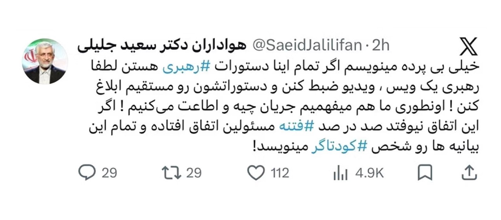 وقتی حساب هواداران جلیلی مینویسد «اگر اینها دستور رهبری است، ویدئو آن را منتشر کنید»، یعنی اعتماد بدنه به مرکزیت قدرت از بین رفته است.