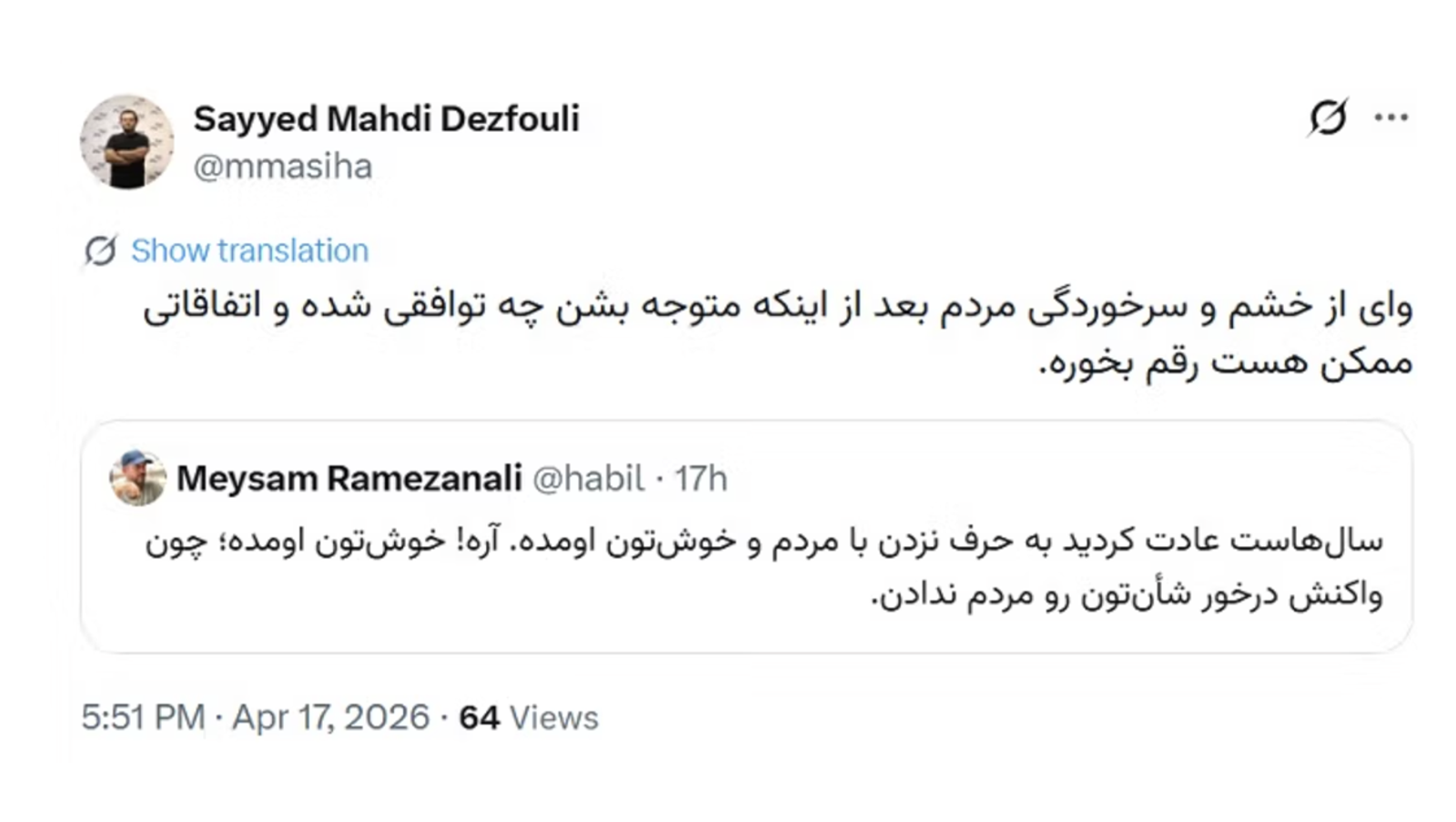 در حالی که هنوز توافق رسمی اعلام نشده، کوچکترین نشانههای عقبنشینی حکومت، با موجی از خشم در میان نیروهای ارزشی روبرو شده است. واکنش تند حسابهای هواداران سعید جلیلی و رائفیپور در شبکه اجتماعی اکس و متهم کردن مسئولان به «فتنه» و «کودتا»، نشاندهنده لرزه در ستونهای نظام است.