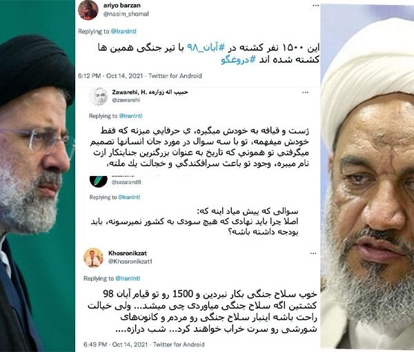 وكتب المغرد "حبيب الله زواره"، تعليقا على كلام رئيسي: "السيد رئيسي يتكلم عن أشياء لا يستوعبها غيره!! لقد كنتَ تحكم (بالإعدام) على حياة الناس بعد أن يخضعوا لثلاثة أسئلة فقط!! أنت ذلك الإنسان الذي سوف يذكره التاريخ باعتباره أكبر مجرم.. وجودك يجلب العار والشنار إلى الشعب"، وكتب "سيد حسين ريحاني": "أنتم الظلمة فاعتبروا.. إذا ما رحلتم فلن يبقى لكم ذكر"، وأشار "سي جي" إلى السجل السيئ لرئيسي في القضاء الإيراني إبان الثورة الإيرانية، وقال في هذا الخصوص: "يقول هذه الجملة شخص أعدم آلاف الناس"، وعلق "كاوه" قائلا: "مَن يقصد هذا المجرم بالظلمة؟ هل المقصود بهم الناس الذين كانوا يحترمون البشر؟ أم الذين كانوا يعدمون الناس جماعات جماعات في عام 1988؟ هذا الرجل في حاجة إلى أن يرقد في مشفى للمجانين وإلا فإنه سوف يستمر في قتل الناس".