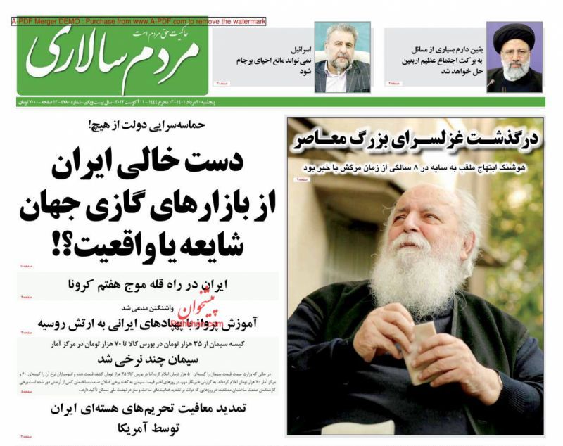في موضوع آخر انتقدت صحيفة "جمله" تصريحات رئيس السلطة القضائية في إيران، محسن إيجه إي، ومطالبته الصحافيين في يوم الصحافة بـ"بث الأمل" والتفاؤل لدى الناس تجاه المستقبل، وعنونت بالقول: "عن أي أمل نكتب؟".