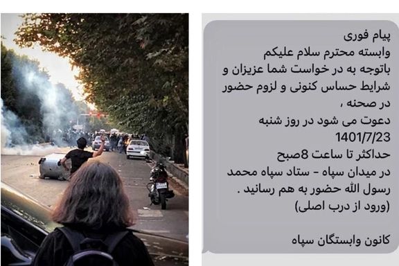 ووفقًا لهذه الرسائل النصية، فقد تم إخبار منتسبي هذه القوات العسكرية التابعة للنظام الإيراني بأنه "في الوضع الحساس الحالي"، ينبغي عليهم الحضور، يوم غد السبت 15 أكتوبر (تشرين الأول)، الساعة 8:00 صباحًا في ساحة "سباه"، مقر محمد رسول الله.