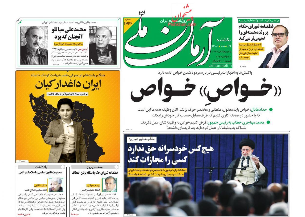 واهتمت صحف اليوم بهذا الموضوع وكأنه أعطى الحل للأزمة أو عالج مشاكل المحافظة التي تشكو الحرمان والتمييز منذ عقود. وعن الموضوع عنونت صحيفة "آرمان ملي": "مولوي عبد الحميد وممثل المرشد يلتقيان.. حل مشاكل البلاد عبر العقلانية".