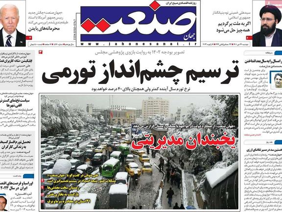 فيما توقعت صحيفة "صمت" أن تعود البلاد إلى أساليب التدفئة المعتمدة قبل تسعينيات القرن الماضي. أما صحيفة "دنياي اقتصاد" فنشرت صورة لحشود كبيرة من المواطنين في محطات النقل العام بعد أن تجمدت العاصمة طهران وشلت حركتها جراء تساقط الثلوج وفشل المسؤولين في احتواء الأزمة والتعامل معها بشكل مدروس كما هو معمول به في دول العالم عندما تهطل الأمطار والثلوج.
