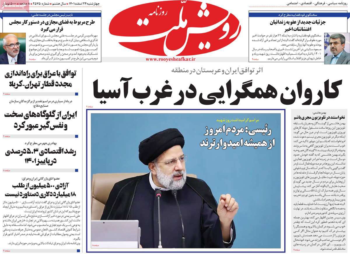 ونقلت صحيفة "ستاره صبح" عن خبراء قولهم إن "تطبيع العلاقات" بين إيران والدول العربية سيساهم في إحياء الاتفاق النووي بشكل ملحوظ، فيما تساءلت صحيفة "وطن أمروز" عما إذا كان سيتم الإلهام من الاتفاق بين إيران والسعودية للتوصل إلى اتفاق مماثل بين روسيا وأوكرانيا بوساطة من بكين كما فعلت مع طهران والرياض.