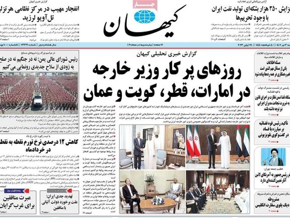 وفي سياق منفصل أشارت صحيفة "كيهان" إلى الجولة الخارجية التي أجراها وزير خارجية إيران، حسين أمير عبداللهيان، إلى عدد من دول المنطقة مثل الإمارات وقطر والكويت وسلطنة عمان وعنونت في مانشيتها حول الموضوع بالقول: "أيام مزدحمة لوزير الخارجية في الإمارات وقطر والكويت وعمان"، واصفة الاستقبال والحفاوة التي حظي بها في هذه الزيارات بـ"غير المسبوقة".