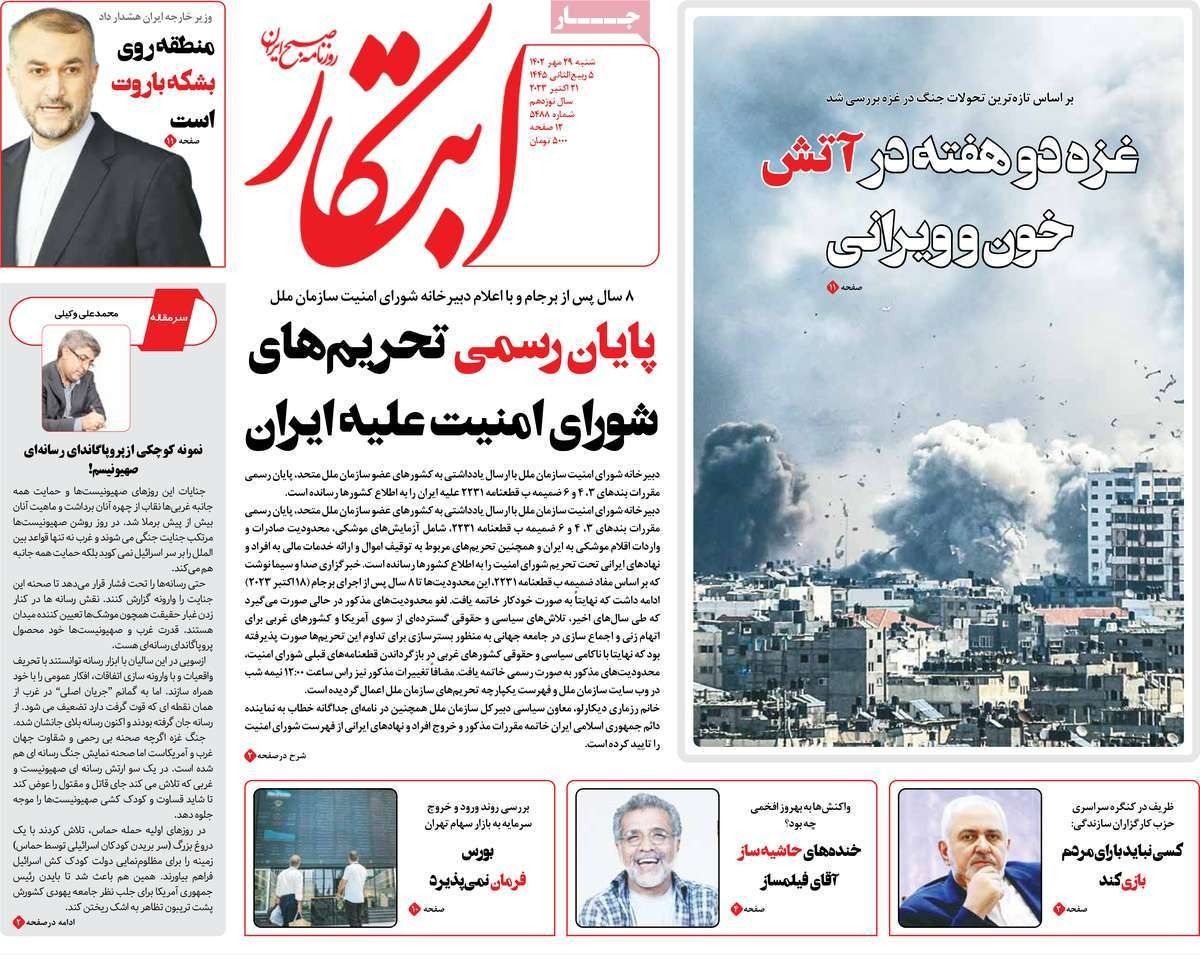 في المقابل، اهتمت الصحف الإصلاحية بالجانب الإنساني من هذا الصراع، وأشارت صحيفة "اعتماد" إلى تبعات هذه الحرب على قطاع غزة المكتظ بالسكان، وعنونت في المانشيت: "كارثة في غزة"، فيما اختارت "ستاره صبح" عنوانا مشابها وكتبت: "جهنم في غزة"، كما حذر رئيس تحريرها علي صالح آبادي في مقاله الافتتاحي من مغبة السقوط في "فخ الغرب وروسيا" وقال إن دخول إيران في هذه الحرب سيحمل البلاد الكثير من الخسائر ويصبح الخروج منها غير ممكن أو مكلفا للغاية.