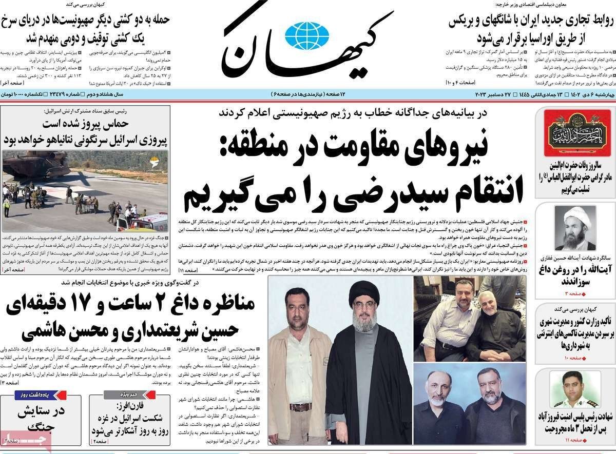 على صعيد الحرب في غزة وانعكاساتها الدولية والإقليمية دافعت صحف النظام، مثل صحيفة "كيهان" التابعة للمرشد علي خامنئي، عن إجراءات جماعة الحوثي، وأشارت إلى تشكيل قوة دولية لحماية الملاحة البحرية في البحر الأحمر بحضور أميركي قوي، وعنونت في مانشيتها نقلا عن الحوثيين: "اليمنيون: سنحول البحر الأحمر إلى مقبرة لسفنكم"، مدافعة عن هذه الأعمال التي اعتبرتها معظم دول العالم بأنها تهديد للاستقرار العالمي.
