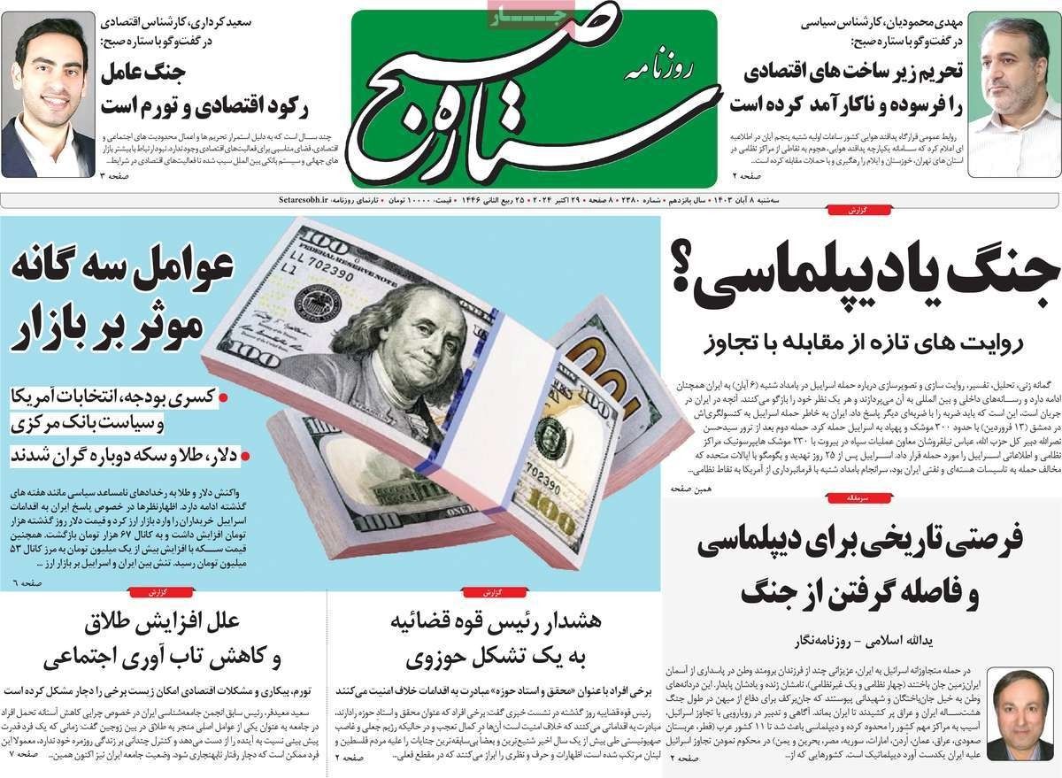 كما تناولت بعض الصحف تقديم حكومة بزشكيان ميزانية العام الإيراني المقبل إلى البرلمان، والحديث عن خطط الحكومة لمواجهة الأزمات الاقتصادية في العام المقبل.