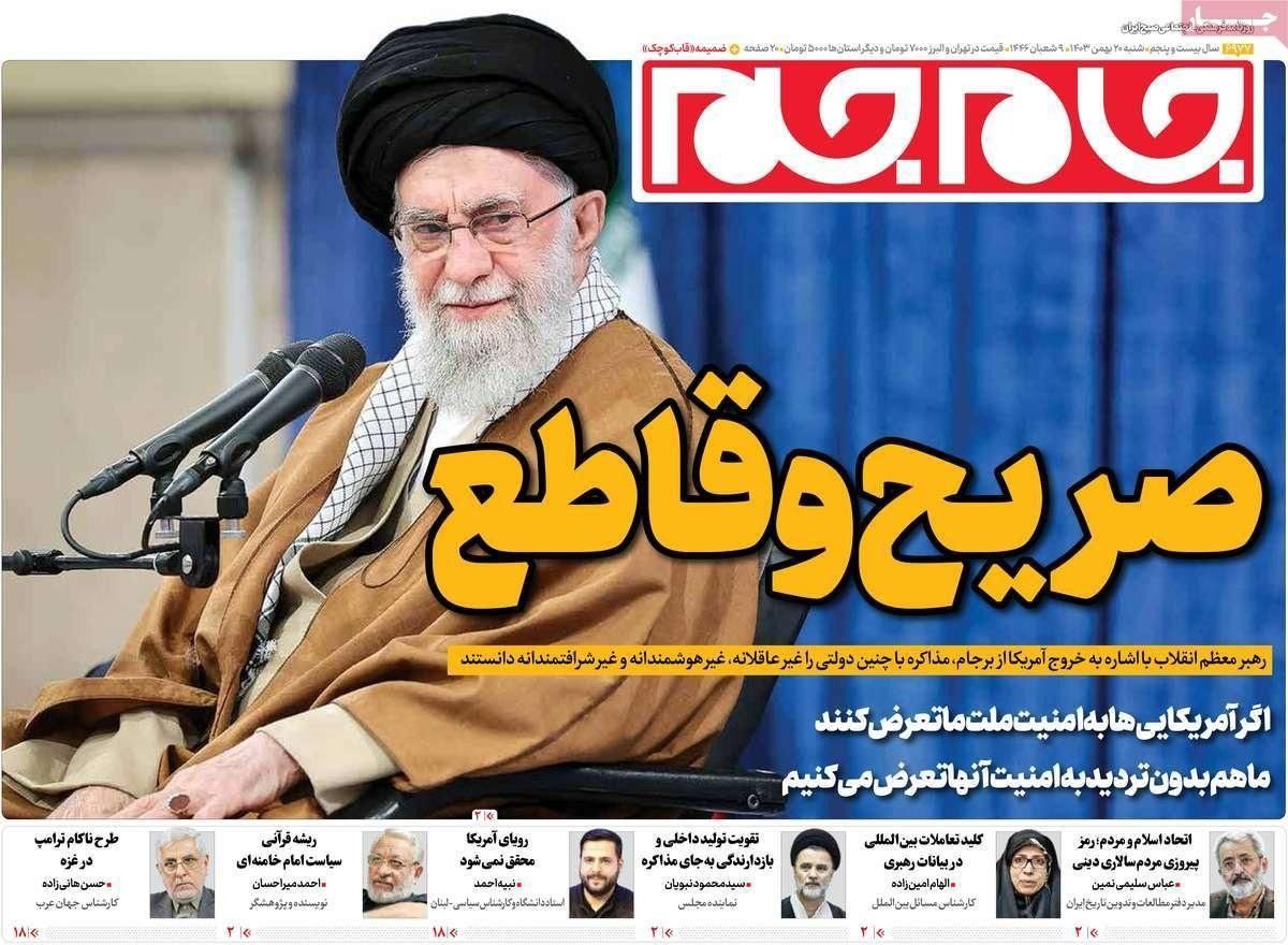 رأت صحيفة "همشهري" أن الاعتقاد بأن ترامب سيكون مختلفا عن جولته السابقة تجاه إيران هو اعتقاد خاطئ ولا حقيقة وراءه مؤكدة أن ترامب هو نفسه ولم يتغير وأن الخيار العسكري ضد إيران سيبقى مطروحا لديه ويجب أن نأخذ هذا الاحتمال على محمل الجد.