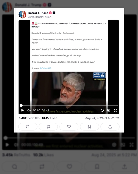 نشر الرئيس الأميركي، دونالد ترامب، عبر منصّة "تروث سوشال" مقطع فيديو لمقابلة قديمة مع النائب السابق لرئيس البرلمان الإيراني، علي مطهري، يظهر فيه وهو يقول إن الهدف الأولي للبرنامج النووي كان "إنتاج قنبلة".