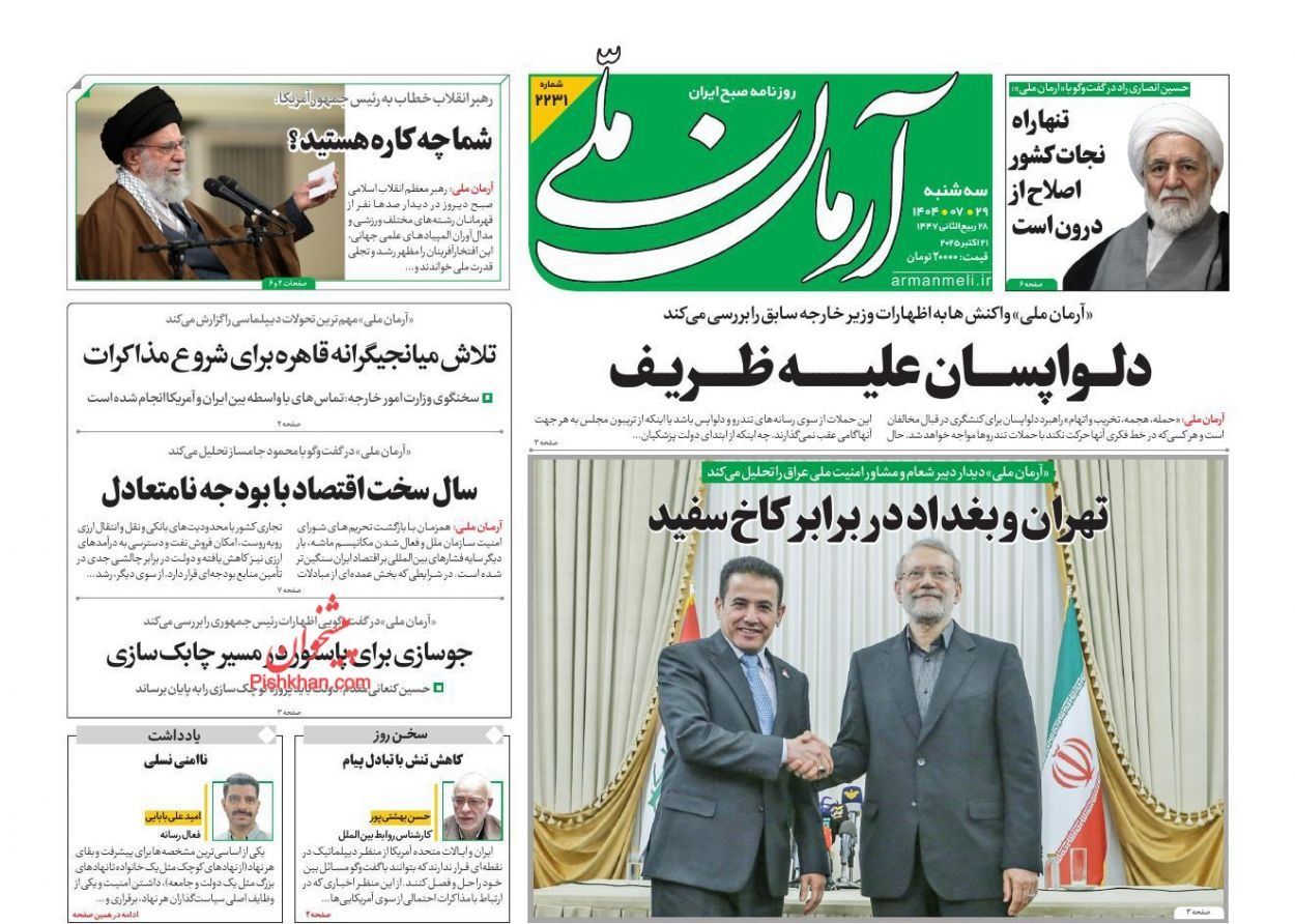 وعلى صعيد آخر، حظيت زيارة أمين المجلس الأعلى للأمن القومي الإيراني، علي لاريجاني، المفاجئة إلى روسيا، باهتمام الصحف؛ حيث تهدف رأت صحيفة "آرمان ملي" الإصلاحية، أنها تهدف إلى تعزيز التحالف الاستراتيجي مع موسكو، ونقل رسالة من المرشد، في خطوة تهدف أيضًا إلى فتح قنوات غير مباشرة للتواصل مع واشنطن عبر الوساطة الروسية، وذلك في سياق التطورات الإقليمية والدولية المتسارعة.