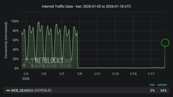 أفادت منظمة "نت بلوكس"، يوم الأحد، بأن بيانات حرکة مرور الشبكة تشير إلى عودة جزئية لبعض الخدمات عبر الإنترنت، ومن بينها "جوجل"، وذلك بعد مرور "238 ساعة من الانقطاع الواسع في شبكة الإنترنت في إيران".