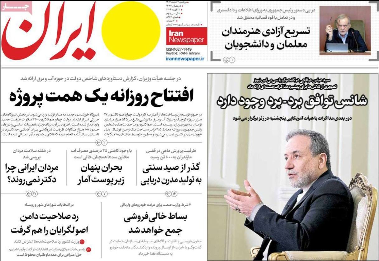 وتداولت مقتطفات من مقابلة وزير الخارجية، عباس عراقجي، مع برنامج "مورنينج جو" على شبكة "إم إس إن بي سي" الأميركية؛ حيث أبرزت صحيفة "إيران" الرسمية، نبرة الوزير المتفائلة بشأن إعداد مسودة اتفاق خلال أيام، معتبرة أن الاتفاق السريع حاجة متبادلة لطهران وواشنطن.