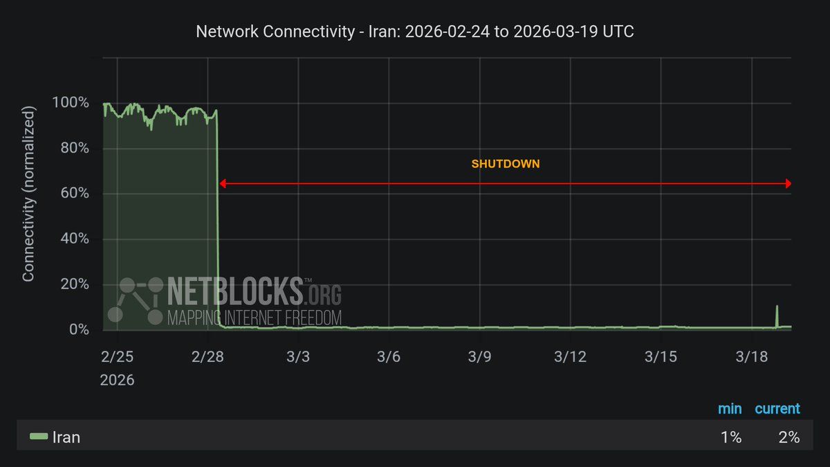 أعلنت منظمة "نت بلوكس" المعنية بمراقبة حركة الإنترنت على مستوى العالم، صباح الخميس 19 مارس (آذار)، أن الانقطاع الشامل للإنترنت في إيران دخل يومه العشرين.