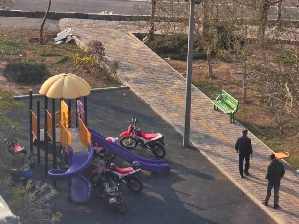تُظهر صورة متداولة على وسائل التواصل الاجتماعي عنصرين من قوات الأمن يقومان بإخفاء دراجتيهما الناريتين بين ألعاب الأطفال داخل إحدى الحدائق.