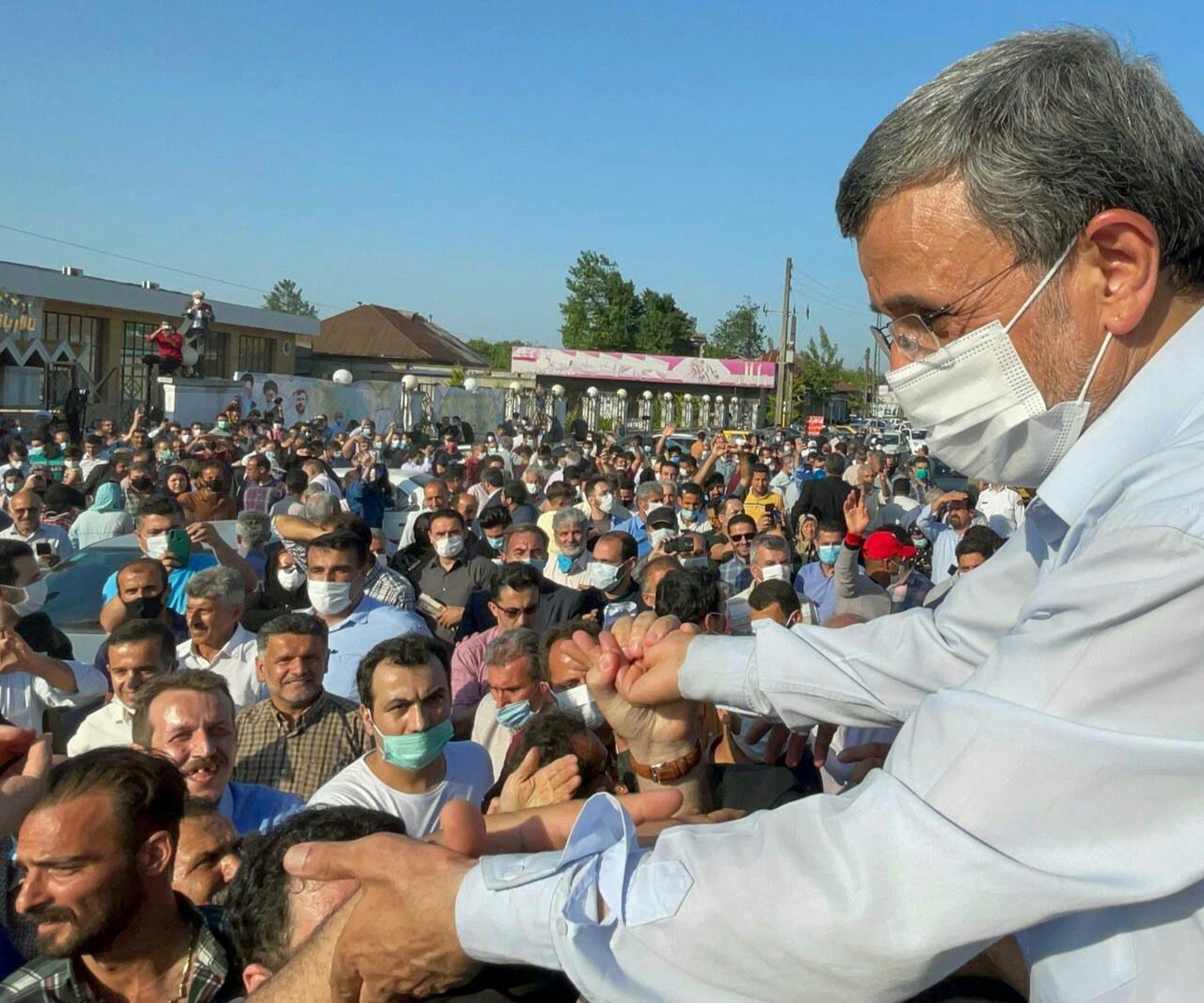 Former president Mahmoud Ahmadinejad meeting provincial supporters in Fras in May 2021