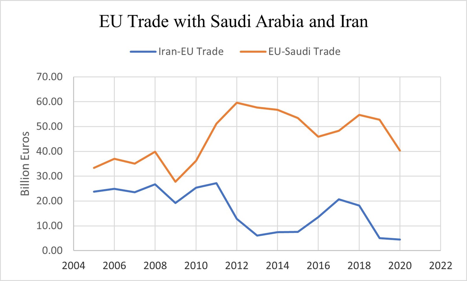 By contrast, trade between the EU and Saudi Arabia, Tehran’s chief rival in the Persian Gulf, benefits from diplomatic stability. Since 2005, EU-Saudi trade has enjoyed a general upward trajectory, even though it is sensitive to volatile markets for oil. However, the Saudis have managed to expand their non-crude exports to the EU. In 2020, 7.2 billion euros — 46 percent of Riyadh’s exports to the EU — were from non-crude oil, up from 3.84 billion euro in 2005.