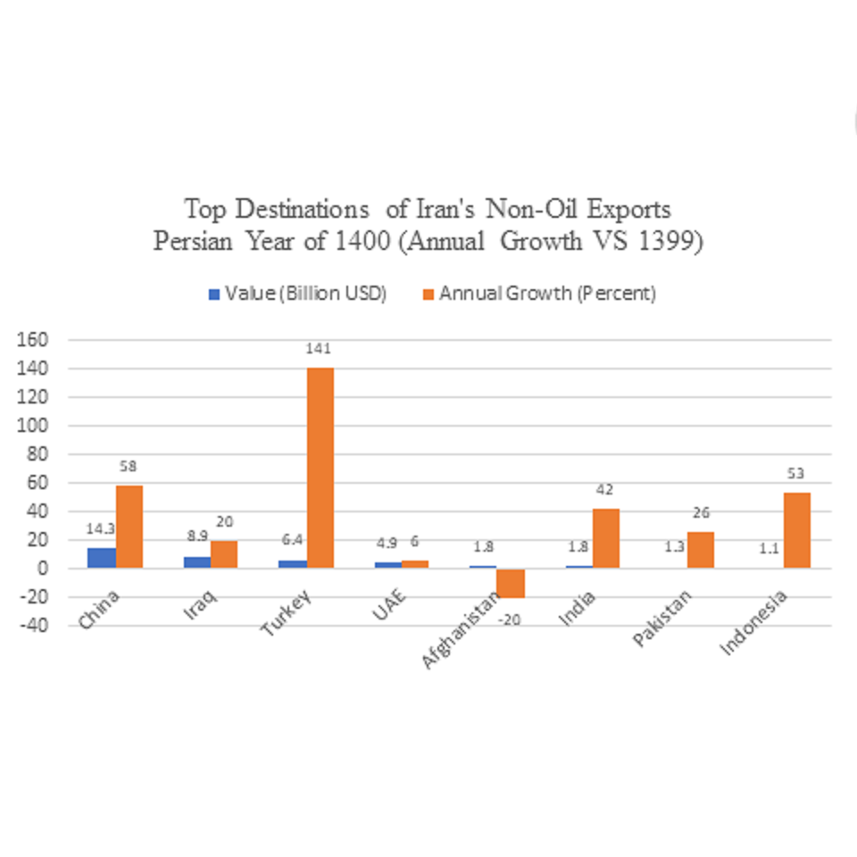 According to a report by the state-run Trade Promotion Center of Iran, key items in Iran’s non-oil exports were natural gas at $4.9 billion and 84 percent growth, polyethylene at $3.1 billion, methanol at $2.2 billion and 87 percent growth, and liquid propane at $1.9 billion and 96 percent growth. Four countries served as the destinations for 70 percent of Iran’s total non-oil export: Tehran exported $14.3 billion to China, $8.9 billion to Iraq, $6.1 billion to Turkey, and $4.9 billion to the United Arab Emirates.