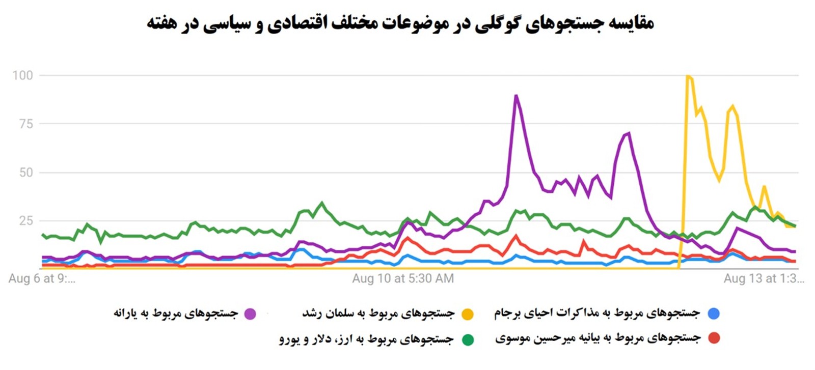 On the other hand, trends in Google searches which reflect people's preoccupations and questions more accurately, indicate that users showed the least degree of interest to the JCPOA and its revival. In other words, there were more searches about Salman Rushdie (yellow graph), subsidies (purple), Mousavi (red), and Forex and gold (green) than about the JCPOA and its revival (blue) [Figure 4]. This shows that a large number of Iranians who use Google search, were far less sensitive about the JCPOA than about other matters.