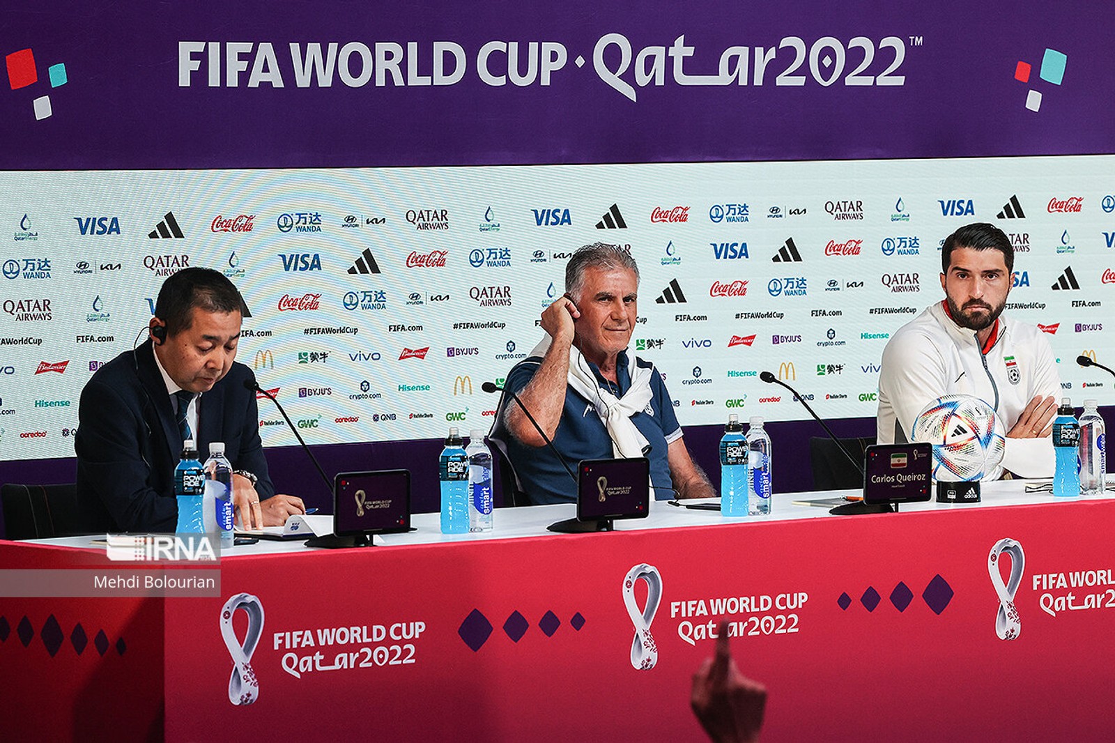 Team Melli coach Carlos Queiroz (center) during the press conference on the eve of the match against the United States on November 28, 2022