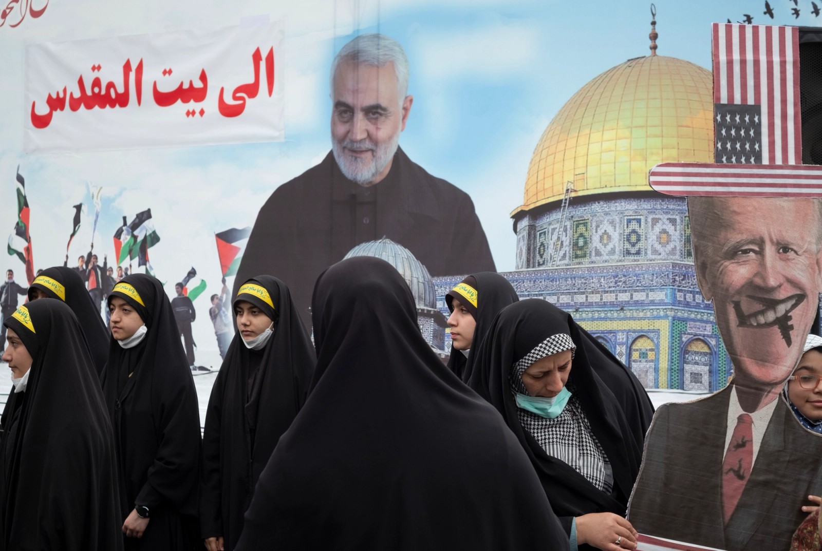 Women in front of a poster on Quds Day that says "on to Jerusalem" in April 2022