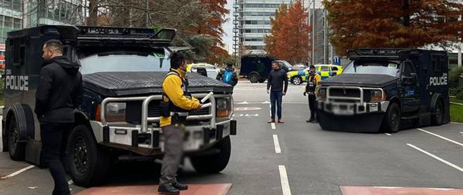 Armored police vehicles are seen outside the headquarters of Iran International on Nov. 19, 2022