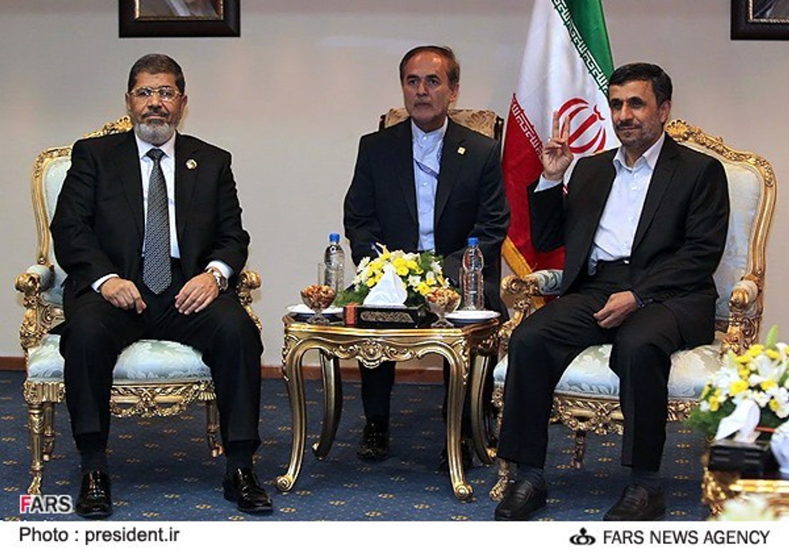 Former president of Iran Mahmoud Ahmadinejad (right) flashes a victory sign during a meeting with his Egyptian counterpart Mohammed Morsi (left) on the sidelines of the Non-Aligned Movement summit in Tehran, on August 30, 2012.