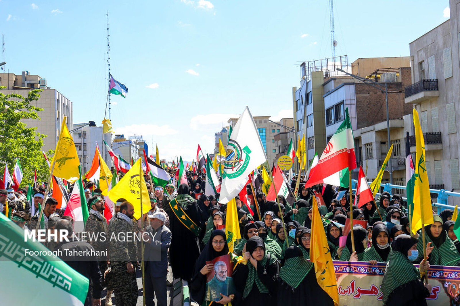 Iranians carrying flags of Iran’s proxy militias during a regime-sponsored demonstration for Quds day in Tehran on April 14, 2023