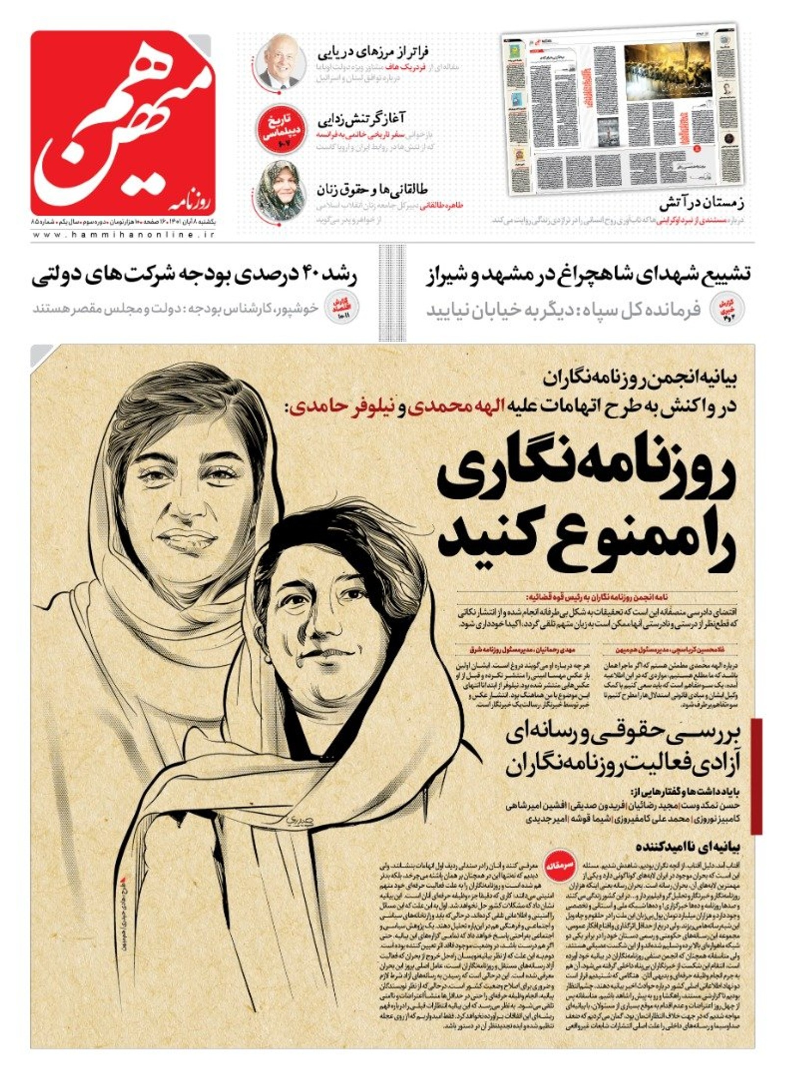 A drawing featuring imprisoned journalists Niloofar Hamedi and Elaheh Mohammadi on the front page of the newspaper "Ham-Mihan" on October 30, 2022. The main title reads 'Ban the journalism' referring to the statement by the Tehran journalists' association against the prisoning journalists over covering protests in Iran.