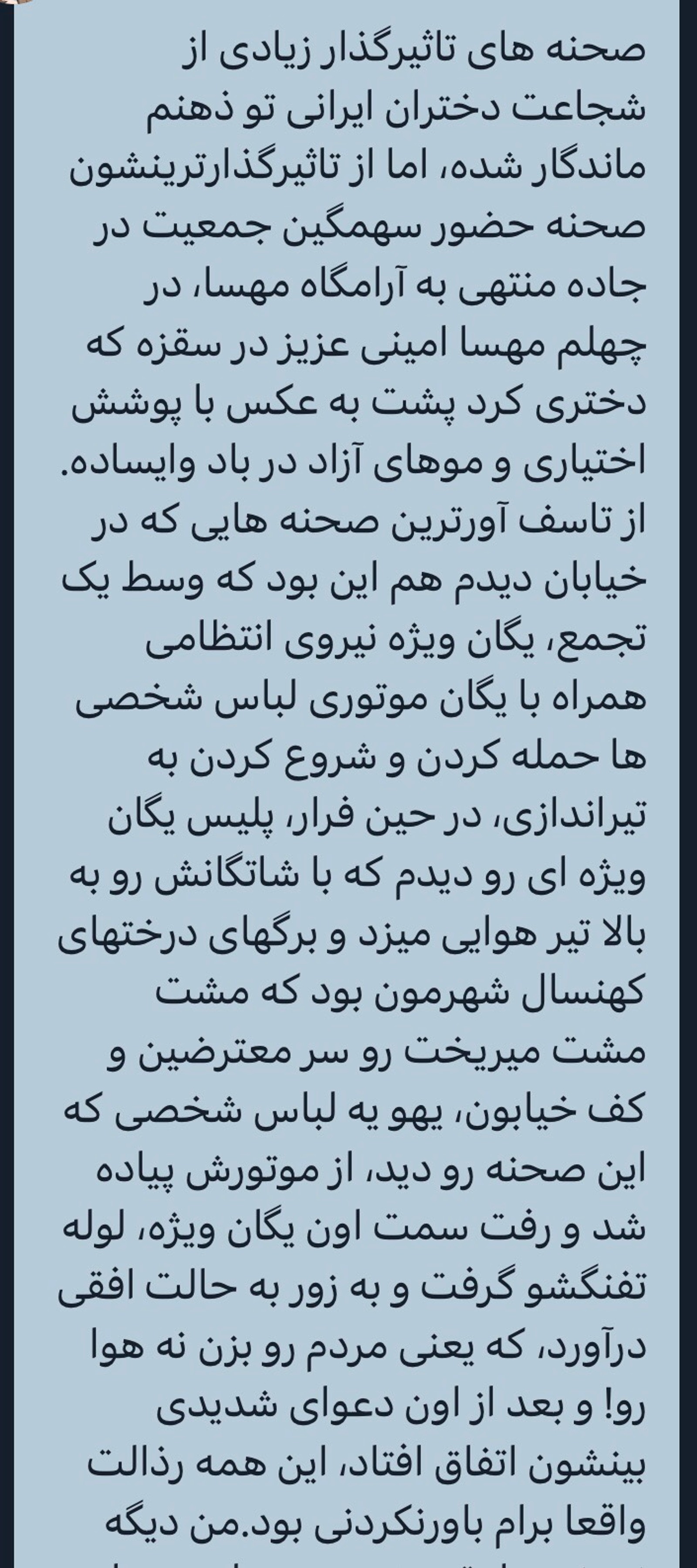 “Mahsa’s killing, another example of the clerical regime’s suppression, increased people’s anger to the extent that it became explosive,” Haleh, 29, who studies arts in Esfahan (Isfahan) said.