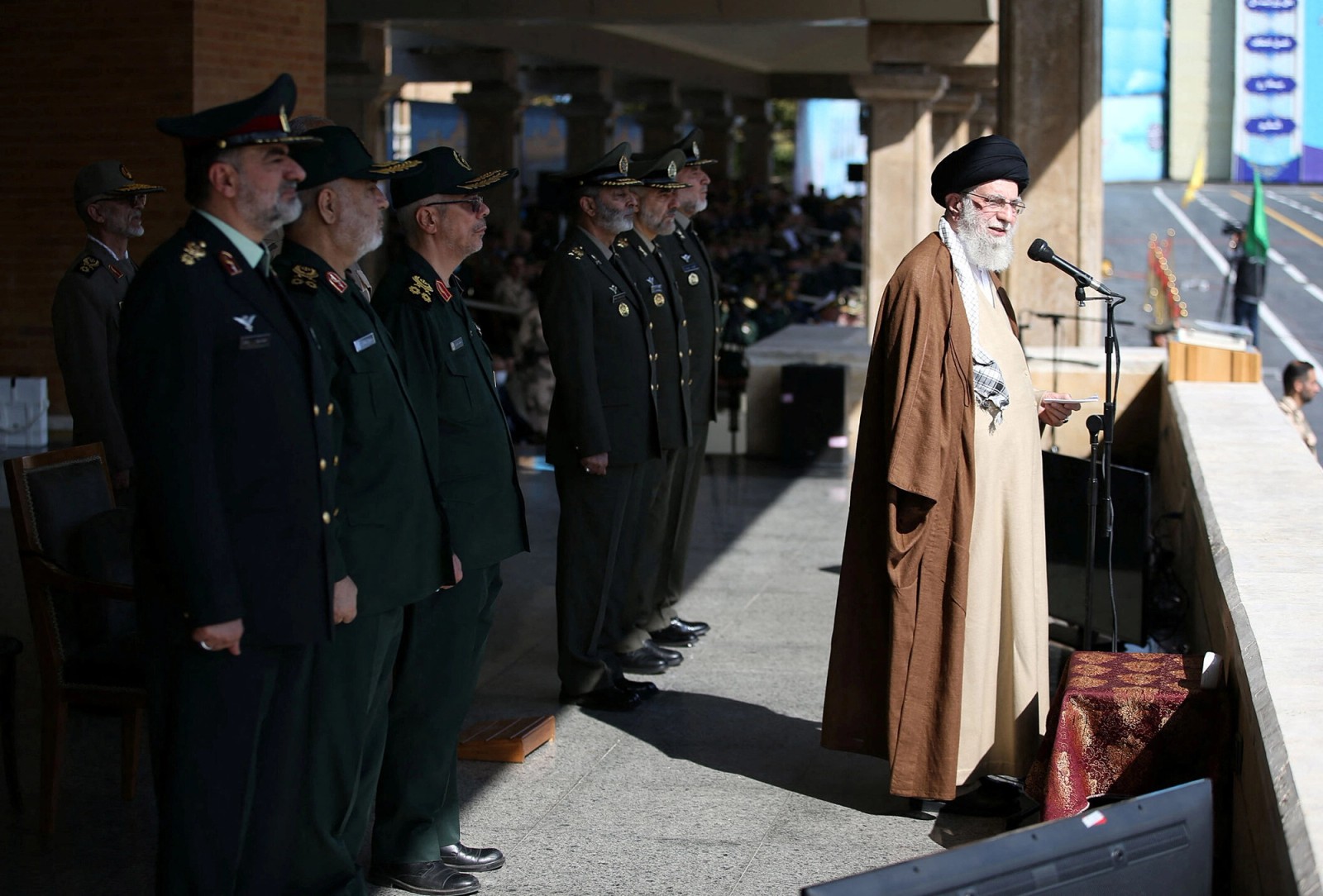 Iran’ Supreme Leader Ali Khamenei and top military commanders of the country during a military event in Tehran on October 10, 2023