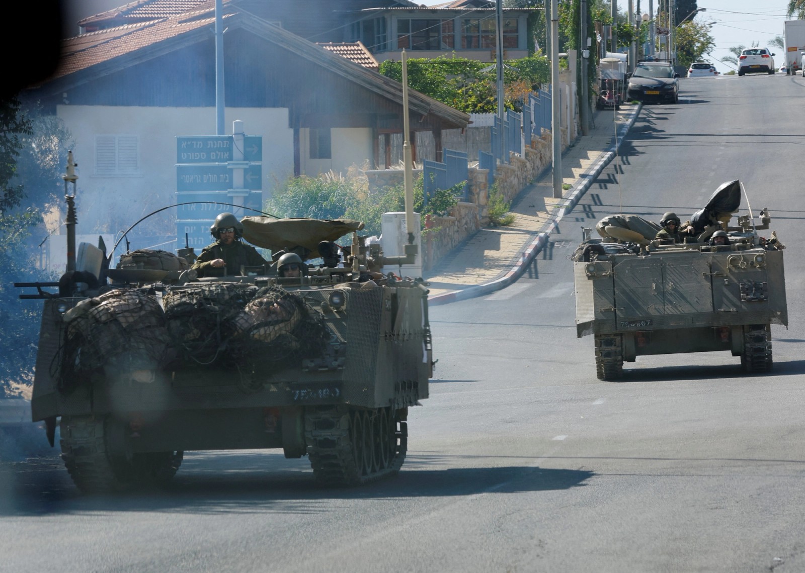 Israeli military vehicles ride in northern town of Shlomi near the border with Lebanon, November 7, 2023.