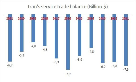 The Central Bank of Iran does not separately publish statistics on the export and import of services, but it publishes the statistics of the trade balance of services (the difference between service exports and imports), which has always been around negative five to six billion dollars in recent years.