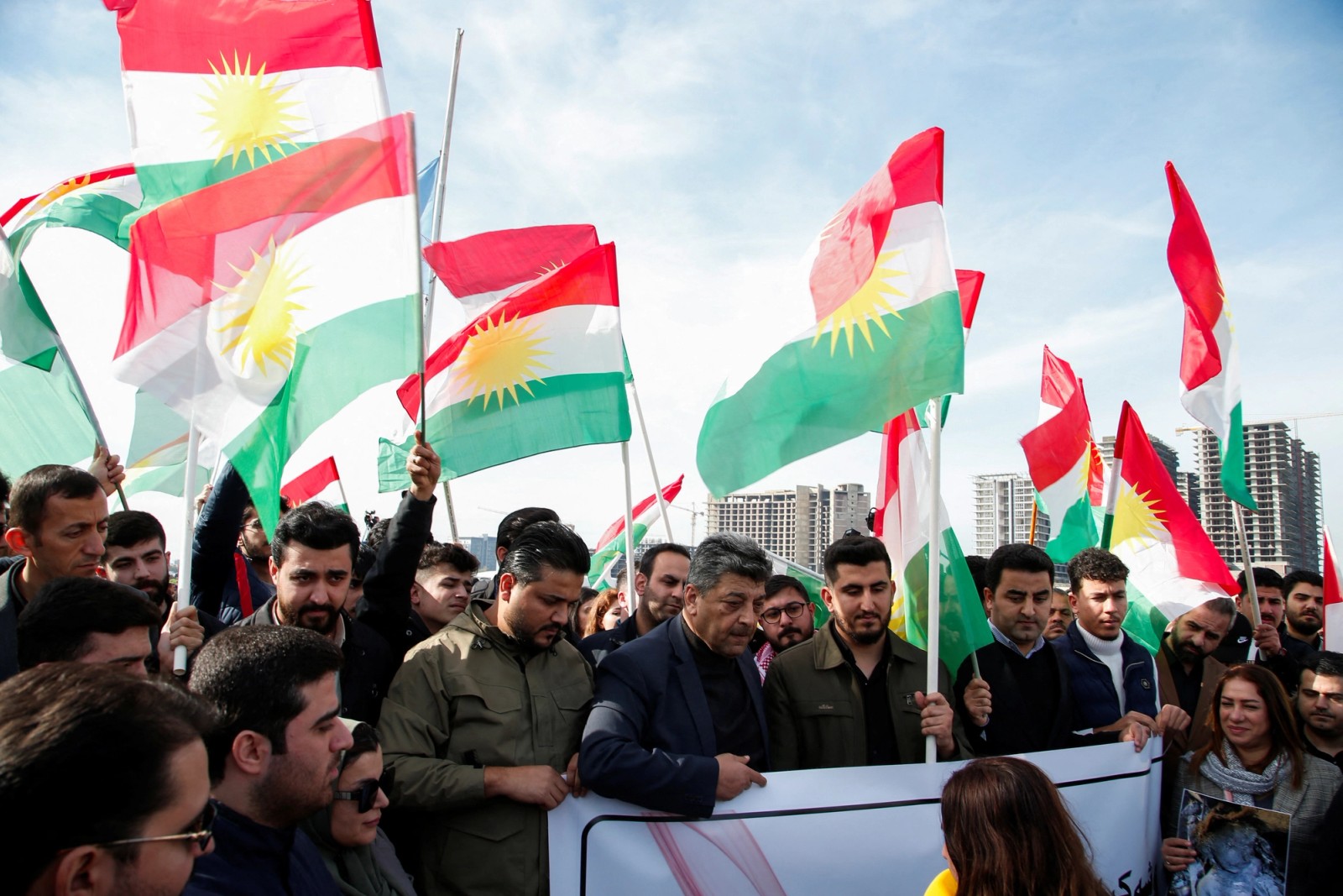 People demonstrate in front of the United Nations headquarters, following missile attacks by Iran's Revolutionary Guards, in Erbil, Iraq, January 16, 2024.