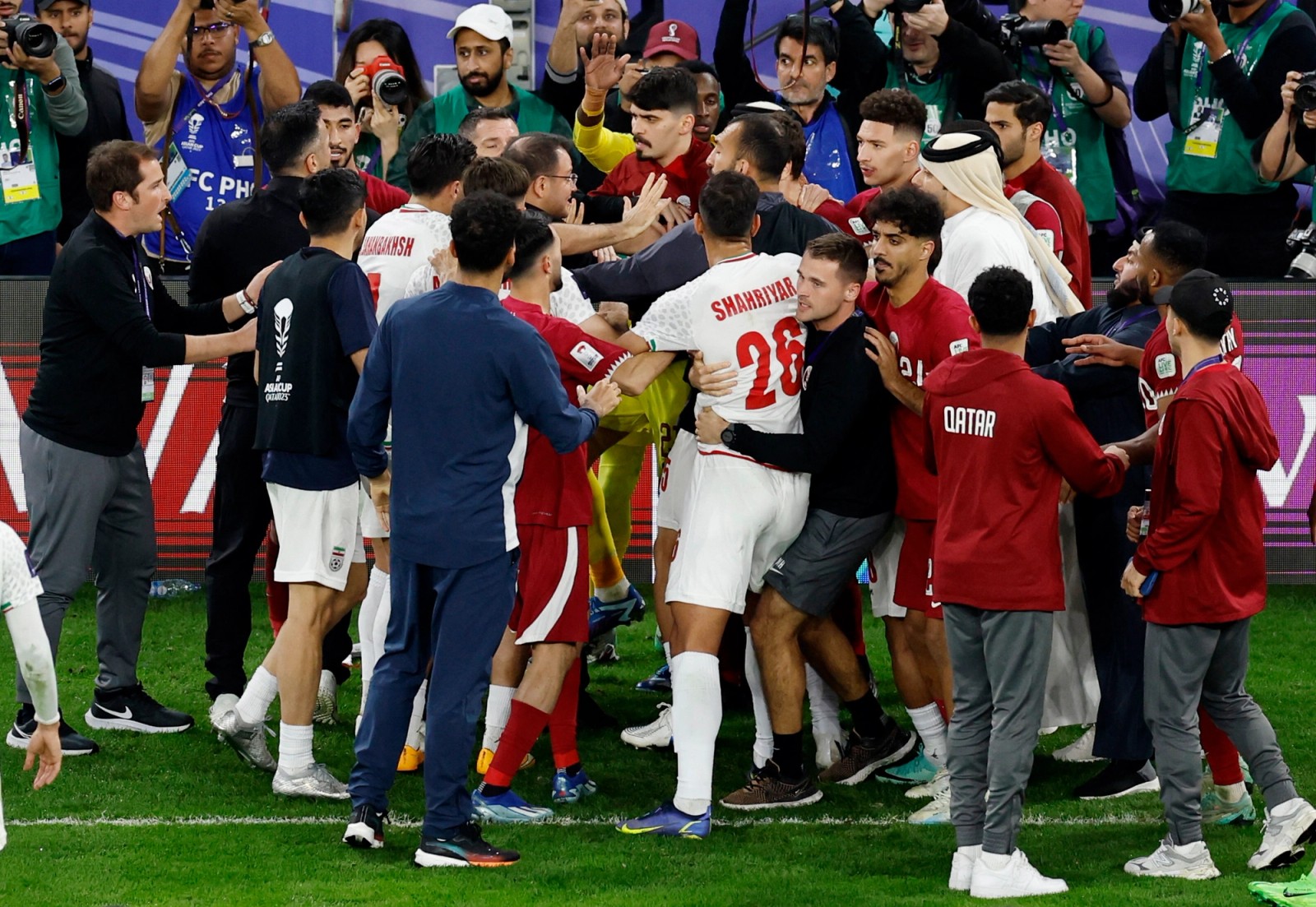 Iran and Qatar players clash after their semifinal match in Doha, Qatar - February 7, 2024. Iran lost the game 3-2.