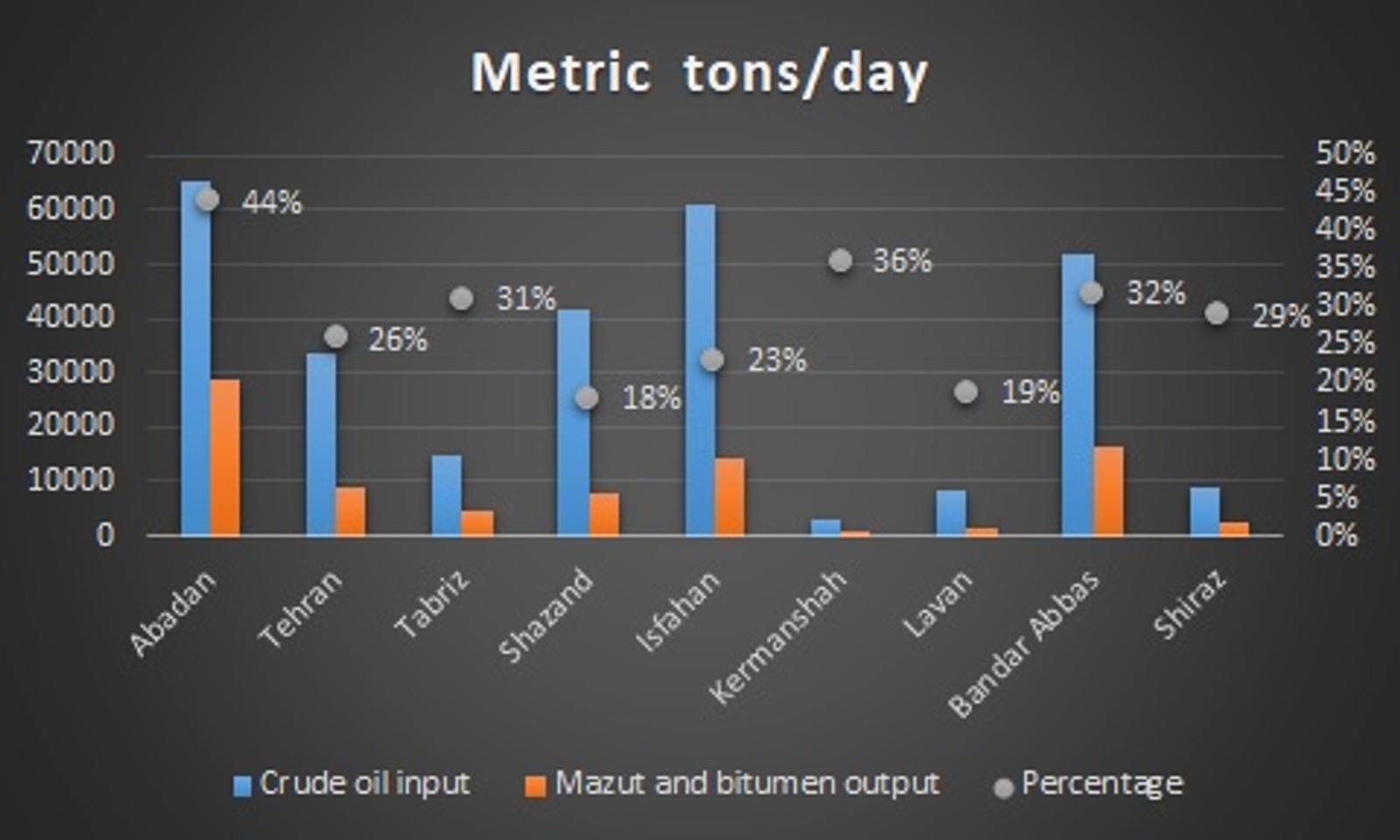Iran's refineries not only convert 30 percent of crude oil into mazut and bitumen, but they also produce highly sulfur-laden fuel, with a sulfur content of 3.5 percent. This sulfur level exceeds the required standards for fuel used in ships navigating open seas by sevenfold. Despite its environmental hazards, Iran utilizes this highly polluting fuel in power plants and industries located within or near urban areas.